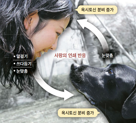 나가사와 교수팀은 사람과 개 사이에도 같은 변화가 나타나는지 확인하기 위해 실험을 했다. 여성 26명과 남성 4명, 그들의 애견 암·수컷 각각 15마리씩을 대상으로 했다. 먼저 주인과 개를 짝 지어 한 방에 넣었다. 이어 천장에 매단 카메라로 30분간 행동을 관찰했다. 개와 눈맞춤을 한 주인은 개를 쓰다듬으며 애정을 표시했다. 사람을 대하듯 개에게 말을 걸기도 했다. 이후 주인과 개의 소변을 검사해 보니, 눈맞춤을 오래한 주인과 개의 옥시토신 수치가 실험 전에 비해 크게 높아진 것이 확인됐다.