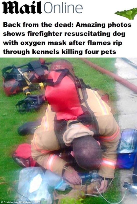 “소방관 중 한명이 불타는 건물에서 구조한 작은 강아지를 잔디밭에 조심스럽게 뉘었어요. 그리고 산소마스크를 씌우고 작업을 시작했습니다. 그리고 작은 생명을 구하기 위해 4명의 소방관들이 모여드는 것을 봤어요.”