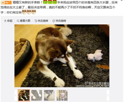그는 웨이보 게시판에 “개에게는 4개의 다리가 있지만 2개의 다리에만 시계를 채워 줬다”면서 “나는 애완견에게 시계를 주기로 최종 결정했지만 어울리지는 않는 것 같다”고 적었다.