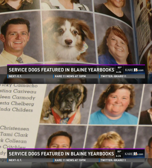영국 미러 등 외신들에 따르면 미국 미네소타 주에 있는 브라인 고등학교가 올해 졸업앨범에 개 2마리의 얼굴을 게재했다. 이름이 다코타와 카멜인 개들은 교사들의 사진을 싣는 페이지에 함께 등장했다.