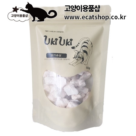 우키우키닭가슴살은 100% 순수 닭가슴살로 만들어진 제품으로 생식수준의 기호성이 뛰어난 제품이다. 더구나 동결건조기법을 사용하여 만들어졌기 때문에 일반적인 생식제품과 비교해보면 보관 방법, 급식 방식의 간편함은 물론 유통기한 또한 넉넉하고 안전하다.