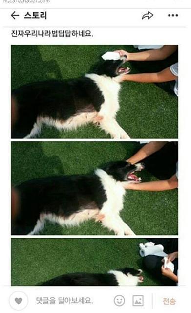 사진에는 보더콜리종 유기견 한 마리가 잔디 위에서 입을 벌린 채 쓰러져 있고, 한 남성이 개의 얼굴을 수건으로 닦아주는 모습이 담겼다.