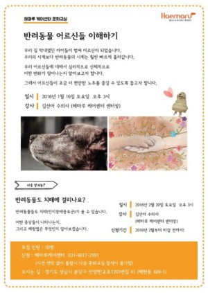 이번 문화교실에세 김선아 해마루 케어센터장은 노령에 접어든 반려동물의 심리적, 신체적 변화에 대해 강의 할 예정이다.