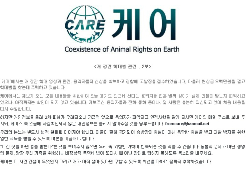 케어는 "케어, 개 성폭행 학대범, 현상금 500만 원"이라는 제목의 글과 함께 학대자를 찾아 경찰 고발하고 개를 구조하겠다고 밝혔다.