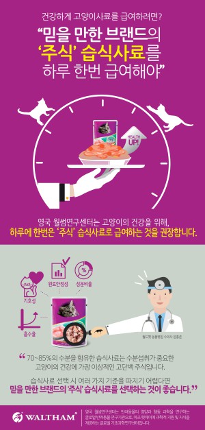 이에 세계판매1위 고양이사료 브랜드 위스카스는 1963년부터 반려동물의 영양과 행동 과학을 연구하는 마즈 펫케어 연구기관인 영국 월썸연구센터(www.waltham.com)의 자문을 통해 고양이집사들에게 현명하게 습식사료를 선택하고 급여하는 방법을 제안한다.