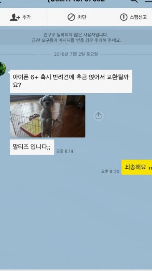 사진 속 구매 희망자는 자신의 반려견 사진을 보내며 강아지에 웃돈을 얹어 아이폰과 교환이 가능한지 물었다. 이에 판매자가 “죄송해요”라고 거절했다.