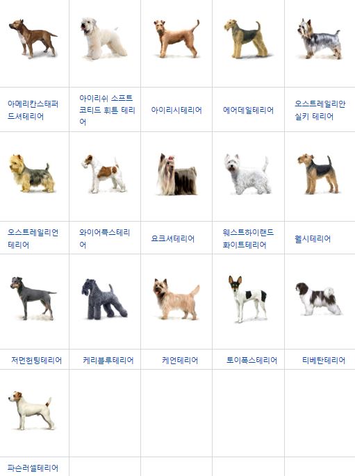 크게 다리가 긴 테리어종과 다리가 짧은 테리어종으로 나뉜다. 다리가 짧은 테리어 종에는 대표적으로 요크셔 테리어, 실리엄 테리어, 스코티시 테리어, 케언 테리어, 댄디 딘몬트 테리어, 스카이 테리어, 웨스트 하이랜드 화이트 테리어 등이 속한다. 다리가 긴 테리어 종에는 레이크랜드 테리어, 베들링턴 테리어, 보스턴 테리어, 불테리어, 핏 불 테리어, 에어데일 테리어, 폭스 테리어, 잭 러셀 테리어 등이 있다.