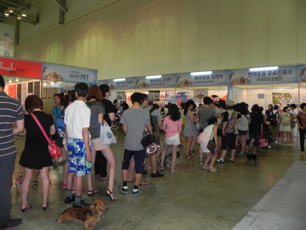 2013 부산국제반려동물박람회에 입장한 관객들이 무료진료소 앞에 줄을 선 모습