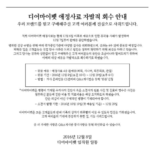 제조업체인 엠엔비물산 박상호 대표도 “소비자분들에게 죄송한 마음 뿐”이라며 “가족과 같은 반려견의 아픔에 속상해했을 마음을 잘 알고 있다”고 말했다. 이어 “무너진 소비자 신뢰를 회복하는데 최선을 다하겠다”고 덧붙였다.