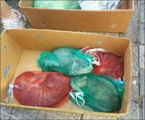 식용으로 판매를 기다리고 있는 양파망 속의 고양이