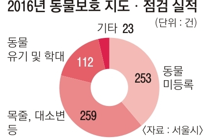 지난해 서울시는 50여 차례의 점검을 통해 동물보호법 위반으로 모두 647건을 적발했다. 배변, 목줄 등 반려견주 준수사항을 어긴 경우가 259건(40%)으로 가장 많았다. 동물 미등록이 353건(39.1%)으로 뒤를 이었고 동물 유기·학대가 112건(17.3%)이었다. 하지만 전체 적발 건수 가운데 과태료를 부과한 경우는 16.4%(106건)에 불과했다.
