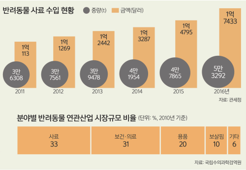 반려동물 연관산업 중 가장 규모가 큰 것은 사료 산업으로, 전체의 27∼33%를 차지하고 있는 것으로 조사됐다. 반려동물 사료산업 규모는 2012년 2500억원에서 지난해 4600억원 수준으로 급격하게 증가한 것으로 추정된다.