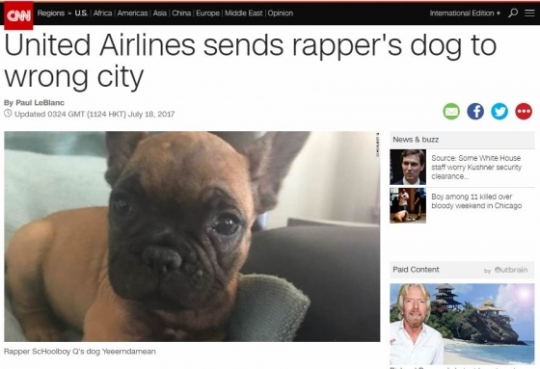 목적지인 버뱅크에 도착한 스쿨보이큐는 그의 반려견을 찾을 수 없었다. 시카고행 항공편에 실려갔기 때문이다. 그는 트위터를 통해 “유나이티드항공, 바보다. 대체 어떻게 내 애견을 다른 비행에 실은 것이냐. 설명하라”고 비판했다.