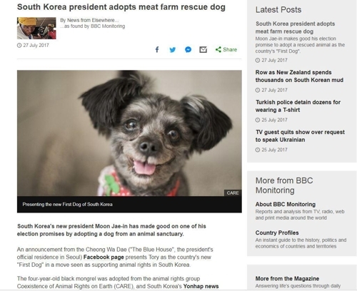 전날 AFP통신도 문 대통령이 "저녁 식탁에 오를 뻔했다가 2년 전 구조된 검은 잡종견 토리를 새 식구로 맞이했다"고 보도했다.