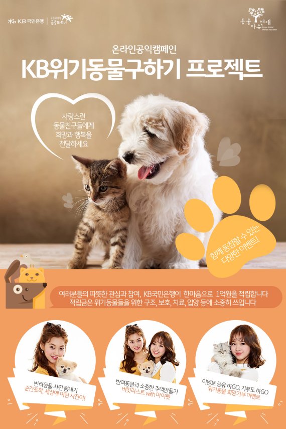 이번 캠 페인은 국민은행 페이스북과 인스타그램에서 고객들의 이벤트 참여에 따라 KB국민은행이 최대 1억원을 기부해 유기동물 입양지원, 길거리 동물 치료 등 위기동물을 구호하는 사업이다.