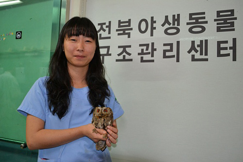 | 매년 구조되는 수십여 마리의 야생동물을 치료해 자연의 품으로 돌려보내는 데 앞장서고 있는 김은주 수의사가 치료를 받고 호전된 큰소쩍새를 안고 있다. | ||