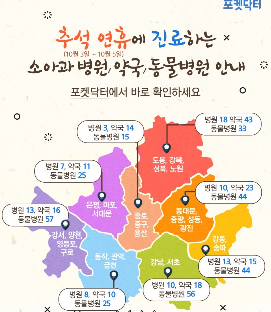 병·의원의 영업정보는 추석 연휴 기간 전체다. 포켓닥터는 이를 위해 지난 18일부터 22일까지 서울지역 576개 소아과병원과 841개 동물병원을 대상으로 한 조사를 통해 연휴가 시작되는 9월 30일부터 마지막 날인 10월 9일 사이에 운영하는 병원과 진료 시간에 대한 정보를 수집했다.