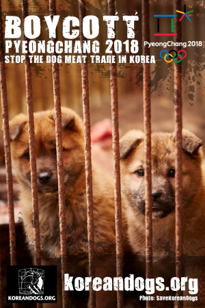 5일 코리아독스 홈페이지(koreandogs.org/pc2018)에는 ‘보이콧 평창 2018’이라는 문구와 함께 강아지 두 마리가 철창에 갇혀 있는 포스터(사진)가 게재돼 있다. 홈페이지 방문자는 평창동계올림픽 보이콧 진정서에 서명도 할 수 있는데, 이미 22만5000명이 서명을 마쳤다. 코리아독스는 30만 명의 서명을 받은 후 진정서를 문재인 대통령과 토마스 바흐 국제올림픽위원회(IOC) 위원장, IOC 위원 등 151명에게 전달할 계획이다.