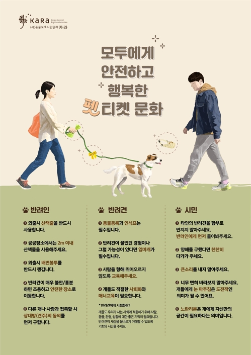 동물보호단체 카라가 작년 11월 시작한 '모두에게 안전하고 행복한 펫티켓 문화' 캠페인도 같은 취지다. 입마개 착용 등 규제를 만들어 반려동물을 통제하는 것보다 펫티켓을 알리고 이를 지키도록 하는 게 안전사고 예방에 효과적이라는 것이다.