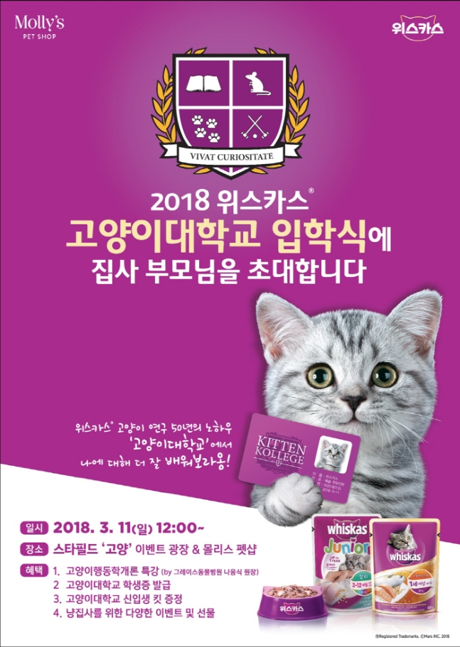 ‘2018 위스카스 고양이대학교 입학식’은 이마트의 반려동물 원스탑 편집숍인 몰리스펫샵과 공동으로 개최된다. 입학식 참여 신청은 오는 3월 3일까지 전국 이마트 스타필트 내 몰리스펫셧 35개점에서 고양이캔이나 파우치 등 고양이 사료나 용품을 구매하는 고객 누구나 침여 가능하다.