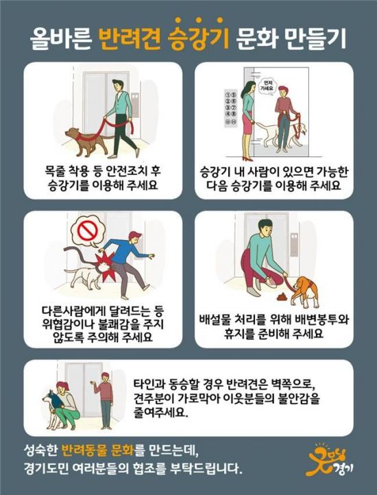 도는 이에 따라 우선 2만부의 '반려견 공동주택 승강기 이용주의사항 스티커 안내문'을 제작해 도내 31개 시ㆍ군 소재 공동주택 1500여곳에 배부하기로 했다.