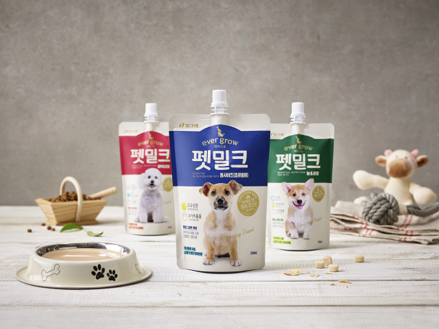 빙그레는 반려동물식품 브랜드 ‘에버그로(ever grow)’를 론칭하고 첫 제품으로 반려견 전용 펫밀크 3종을 출시한다고 밝혔다. 에버그로 펫밀크 3종은 제품 특징을 알 수 있도록 제품명을 ‘눈관절(150㎖)’, ‘피부모발(150㎖)’, ‘홈사이즈(초유함유·250㎖)로 만들었다.