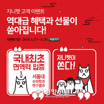 지니펫 홈페이지(www.ginipet.co.kr)와 정몰(www.kgcshop.co.kr)에서는 ‘지니펫 해피박스’를 1만원에 선착순(1088세트) 판매한다. 해피박스 안에는 지니펫 사료를 포함한 최대 10만원 상당의 다양한 영양제 및 간식이 담겨있다.