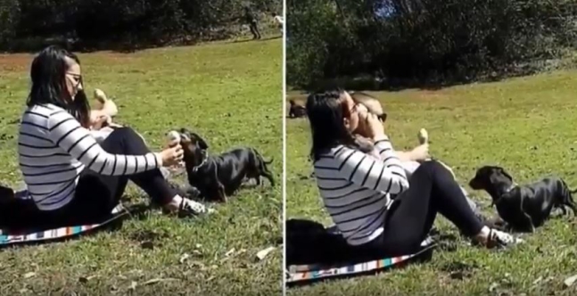 연인은 공원 잔디 위에 작은 담요를 깔고 앉아 아이스크림을 먹으며 한가로운 오후 시간을 보내는 중이었다. 그 때 사람들의 시선을 바로잡은 것은 두 사람 앞에 앉아있는 반려견 닥스훈트였다.