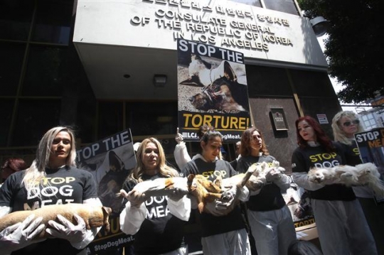 이들은 'STOP DOG MEAT'라고 적힌 티셔츠를 입고 죽은 개를 들고 나와 항의하는 퍼포먼스를 선보였다.