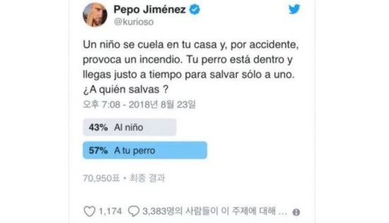 최근 Kurioso라는 아이디를 가진 이는 “모르는 아이가 당신 집에 몰래 들어왔다가 실수로 불을 냈다. 집 안에는 당신의 개가 있다. 당신은 둘 중 누구를 구하겠는가?”라는 글을 올렸다.