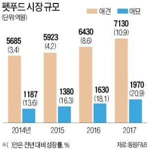이처럼 애묘 인구가 크게 늘면서 펫푸드 시장도 동반 성장 중이다. 2013년 1045억원에 그쳤던 국내 고양이 펫푸드 시장 규모는 지난해 1970억원으로 배 가까이 커졌다. 올해엔 2000억원을 훌쩍 넘어설 것으로 예상된다. 지난해 반려견 펫푸드 시장 규모(7130억원)에 비하면 작지만 성장률은 반려견보다 2~5배 가까이 높다.