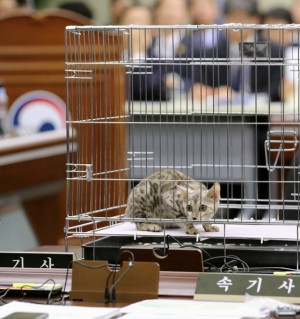 이날 김 의원은 국정감사에 지난달 18일 대전동물원에서 퓨마가 탈출, 사살된 것을 두고 “같은 고양잇과”라며 어린 벵갈 고양이를 철창에 담아 데려왔다.