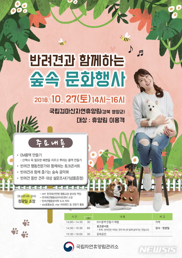 주요 프로그램은 ▲반려견 행동전문가 정광일 소장과 함께하는 토크콘서트 ▲반려견의 정서를 고려한 숲속 음악회 ▲배변 후 뿌리는 EM 용액 만들기 체험 ▲반려견 문화를 위한 설문조사 등이다.