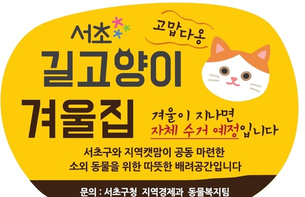 3일 구에 따르면 겨울철 반려동물 한파대책은 ▲길고양이 겨울집 만들기 ▲한파 경보(-15도 이하) 예보시 상황실 운영 ▲재건축단지내 고양이 거주지 이동 ▲길고양이 중성화(TNR)사업 등이다.