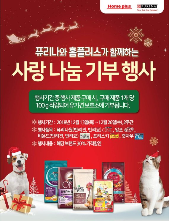 행사 기간 동안 전국 홈플러스 매장에서 맞춤 건강식 브랜드 ‘퓨리나 원’과 내추럴 펫푸드 ‘비욘드’를 비롯해 알포, 프리스키, 캣차우 등 총 5종을 30% 할인 판매하고, 판매 제품 1개 당 사료 100g을 적립해 유기동물 보호소에 기부한다.