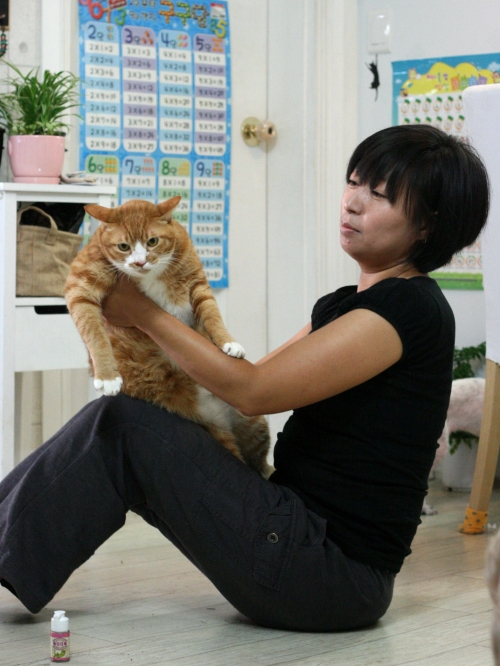 ▼ 회장 이신영 : 뇌진탕에 걸렸던 강아지, 말티즈(13)와 화이트쉐이커신드롬이라는 희귀병으로 온몸을 심하게 떨고 흔드는 푸들(12). 이 아이는 혼자 밥도 못 먹어 생후 45일에 버려져 인터넷에 올라왔다. 그리고 화장실 변기 훈련이 가능한 기특한 꼬맹이, 코숏(코리안숏헤어)은 젖먹이 시절 길에 버려진 고양이를 친구가 구조해 맡긴 것이다. 당시 나는 만삭인 상태라 젖병으로 분유를 먹여 키운 아이로 살이 심하게 찐 돼지 고양이(8)다.