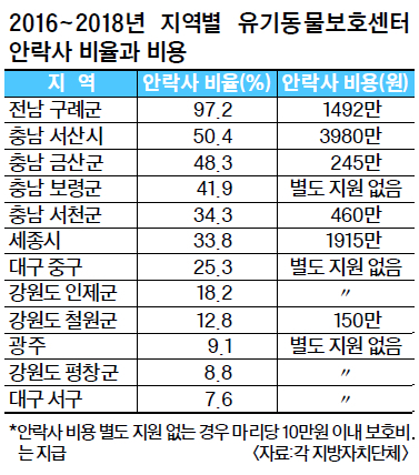 안락사 시행 비율은 구례군이 97.2%로 가장 높았다. 유기동물 수가 매년 2~3배씩 증가해 보호공간이 부족한 탓이다. 서산시(50.4%)와 금산군(48.3%), 보령군(41.9%) 등이 뒤를 이었다.