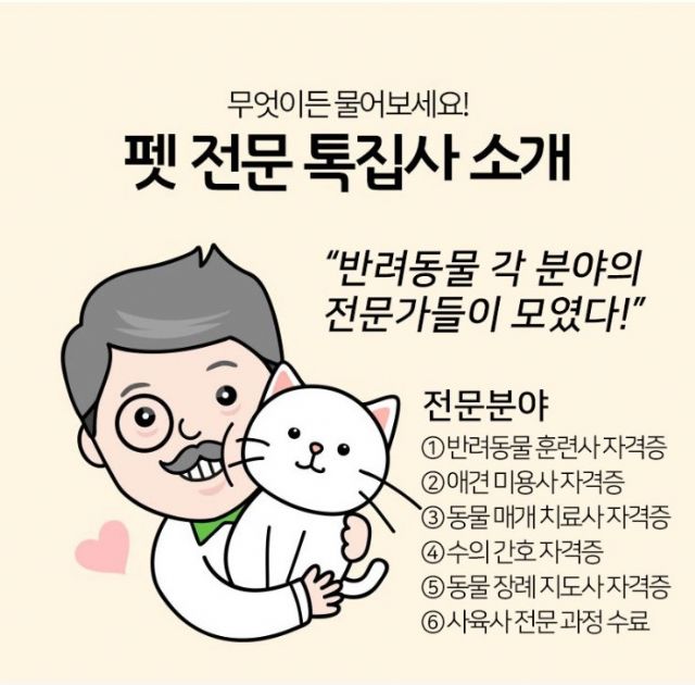 주요 상담 분야는 ▲건강 ▲미용 ▲훈련 ▲사료 등이 있으며, 각각의 반려동물 생애주기에 따라 A부터 Z까지 맞춤형 상담 서비스를 제공한다.