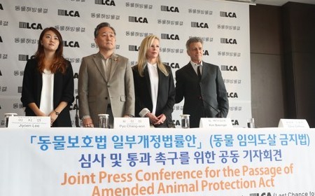 킴 베이싱어와 표창원 더불어민주당 의원, 동물권 단체인 '동물해방물결', 국제 동물권 단체인 동물을 위한 마지막 희망(LCA)은 11일 서울 중구 더 플라자에서 기자회견을 열고 "모든 동물은 법에 따라 예외적인 경우를 제외하곤 임의도살이 금지돼야 한다"고 강조했다.