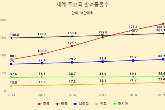 유로모니터 인터내셔널에 따르면, 지난해 중국의 개·고양이 등 반려동물 수는 1억7110만 마리를 기록해 미국의 반려동물 수를 처음으로 넘어섰다. 올해도 지난해 대비 10% 가량 증가, 1억8850만 마리를 기록하면서 세계 1위를 차지했다.