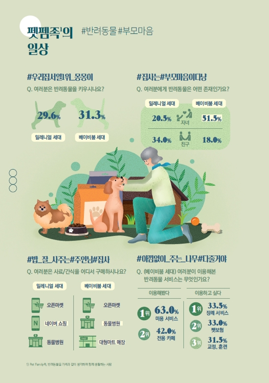 밀레니얼 세대는 29.6%, X세대(1975∼1984년생)는 25.4%, 베이비붐 세대는 31.3%가 반려동물을 기르는 것으로 조사됐다.