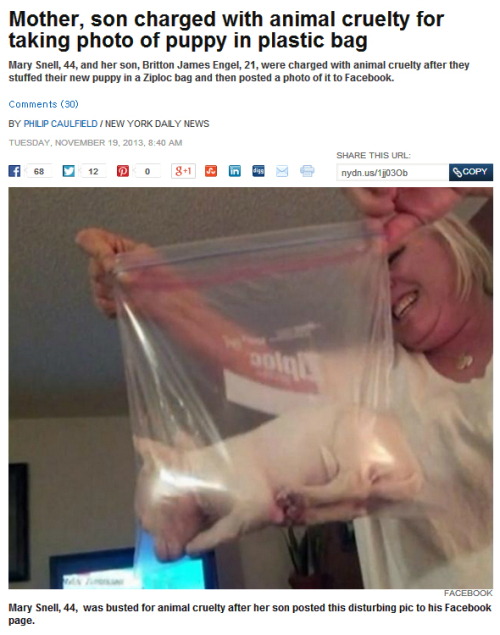 보도에 따르면 메리 스넬(44)과 그의 아들 브리튼 제임스 엥겔(21)은 최근 갓 태어난 강아지를 지퍼백에 담았다가 동물 학대 혐의로 체포됐다. 두 사람은 지퍼백에 든 강아지를 촬영한 뒤 사진을 페이스북에 올린 것으로 알려졌다.