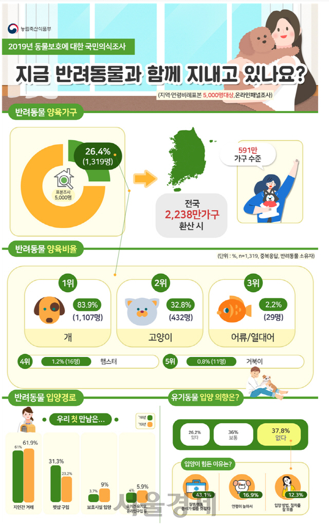 농림축산식품부가 2일 발표한 ‘2019년 동물보호에 대한 국민의사조사’ 결과에 따르면 반려동물을 키우는 가구는 전국 2,238만 가구 중 591만 가구로 집계됐다. 조사는 동물보호와 복지 관련 정책 기초자료로 활용하기 위해 정부가 지난 2006년부터 실시하고 있다. 전국 가구 수와 반려동물 양육 가구 수는 전체 표본조사 대상 5,000명을 환산한 수치다.