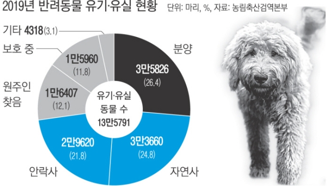 지난해 주인에게 버림을 받거나 길을 잃어 보호시설에 들어간 반려동물이 13만5000마리가 넘는 것으로 집계됐다. 이 중 다시 주인 품에 안긴 동물은 10마리당 1마리에 그친 반면 절반 가량은 자연사나 안락사를 당한 것으로 나타났다.