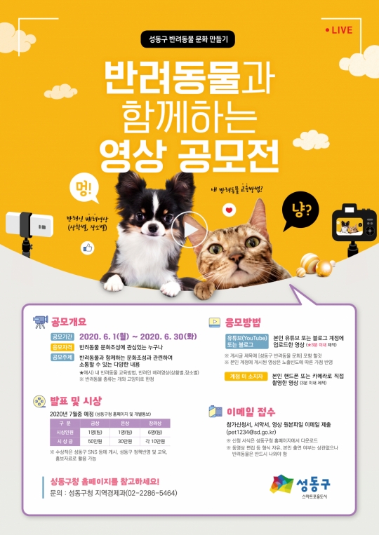 서울 성동구(구청장 정원오)가 주민이 직접 참여하는 반려동물 문화조성을 위해 6월 한 달 간 ‘반려동물과 함께하는 영상 공모전’을 개최한다.