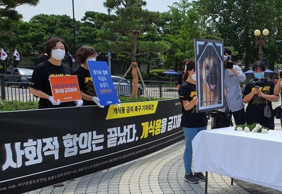 이어 "정부와 국회의 비겁한 변명에도 불구하고 주요 개시장의 연이은 몰락, 개식용 금지를 촉구하는 국민청원, 지치지 않는 개식용 종식 법안과 사법부의 판단에 이르기까지 개식용 금지를 향한 사회적 합의는 이미 끝났다"며 "정부와 국회는 더 이상 사회적 합의라는 비겁한 방패 뒤에 숨어 민의를 저버려서는 안 된다"고 거듭 강조했다.