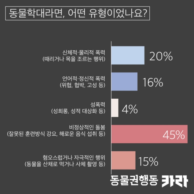 모니터링단은 해당 영상의 20%가량인 83개의 영상을 ‘동물 학대’ 영상으로 판단했다. 동물 학대의 유형으로는 ‘비정상적인 돌봄’이 약 45%(63개)로 가장 높게 나타났다. 이 영상들에는 반려동물에게 장애물이나 투명벽 피하기와 같은 행동을 계속 강요하거나 야생동물의 습성과는 전혀 상관없는 공간에 두거나 촬영을 목적으로 괴롭히는 영상들이 포함됐다.
