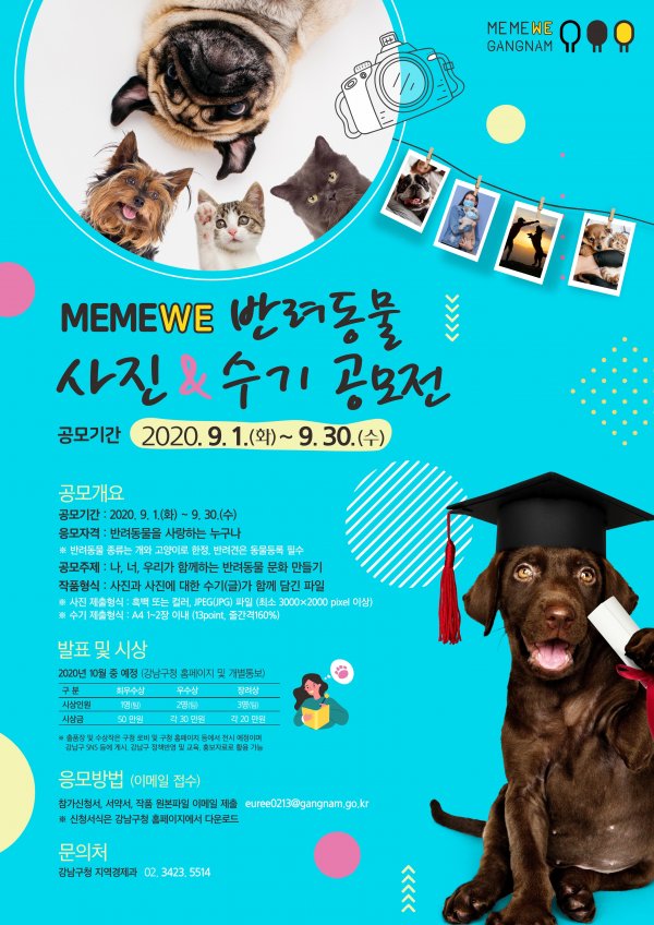 ‘MEMEWE 반려동물 사진·수기 공모전’에 대해 보다 자세한 사항은 구청 지역경제과로 문의하면 된다.