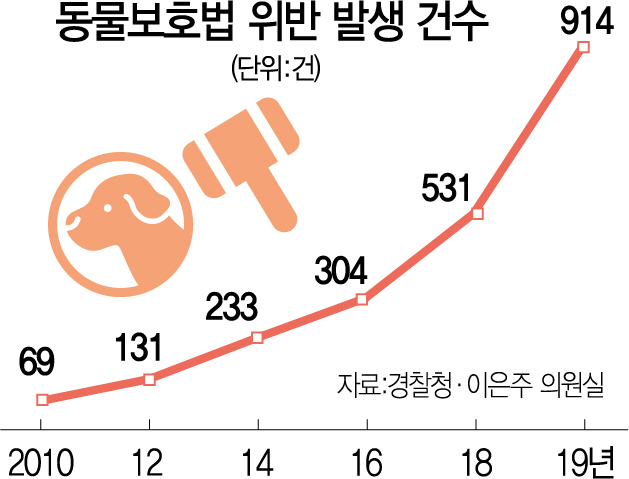 반려동물인구가 늘면서 동물학대 사건은 매년 가파르게 증가하는 추세다. 경찰청에 따르면 2010년 69건에 불과했던 동물보호법 위반 사례는 지난해 914건으로 9년 만에 13배 넘게 급증했다. 같은 기간 동물보호법 위반 피의자는 78명에서 973명으로 13배 가까이 늘었다. 하지만 2010~2019년 경찰 수사를 마치고 검찰에 송치된 3,360명 중 구속된 인원은 단 4명에 불과했다. 지난해 송치인원 973명 중 구속 피의자는 단 한 명도 없었다. 길고양이 토막살해 사건 등 잔혹한 동물학대범죄가 잇따르는 것과는 대조적이다.