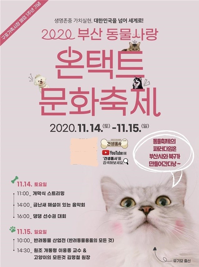 부산시는 북구와 함께 구포가축시장 폐업 1주년을 맞아 오는 14과 15일 이틀간 ‘2020 부산 동물사랑 온택트 문화축제’를 개최한다고 5일 밝혔다.